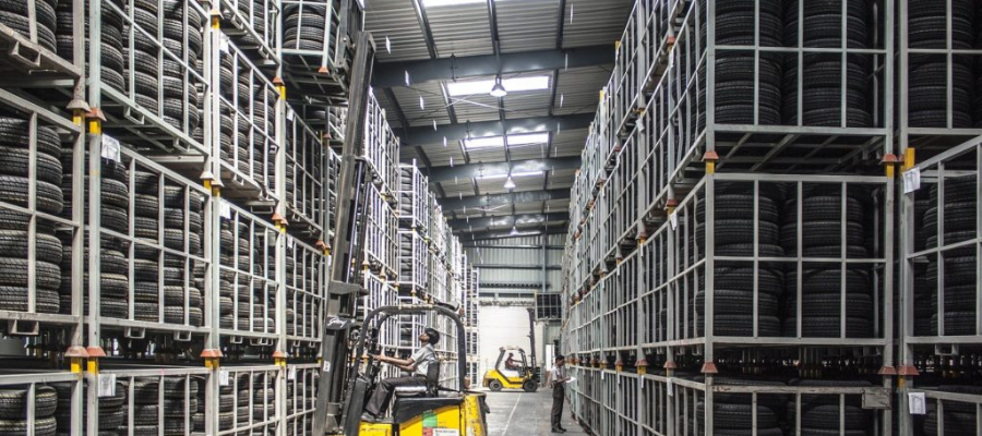 Warehouse interior with tall shelves stacked with tires. Two forklifts operate in the aisle, one closer to the camera and another farther away. Overhead lights illuminate this busy industrial forklift environment.